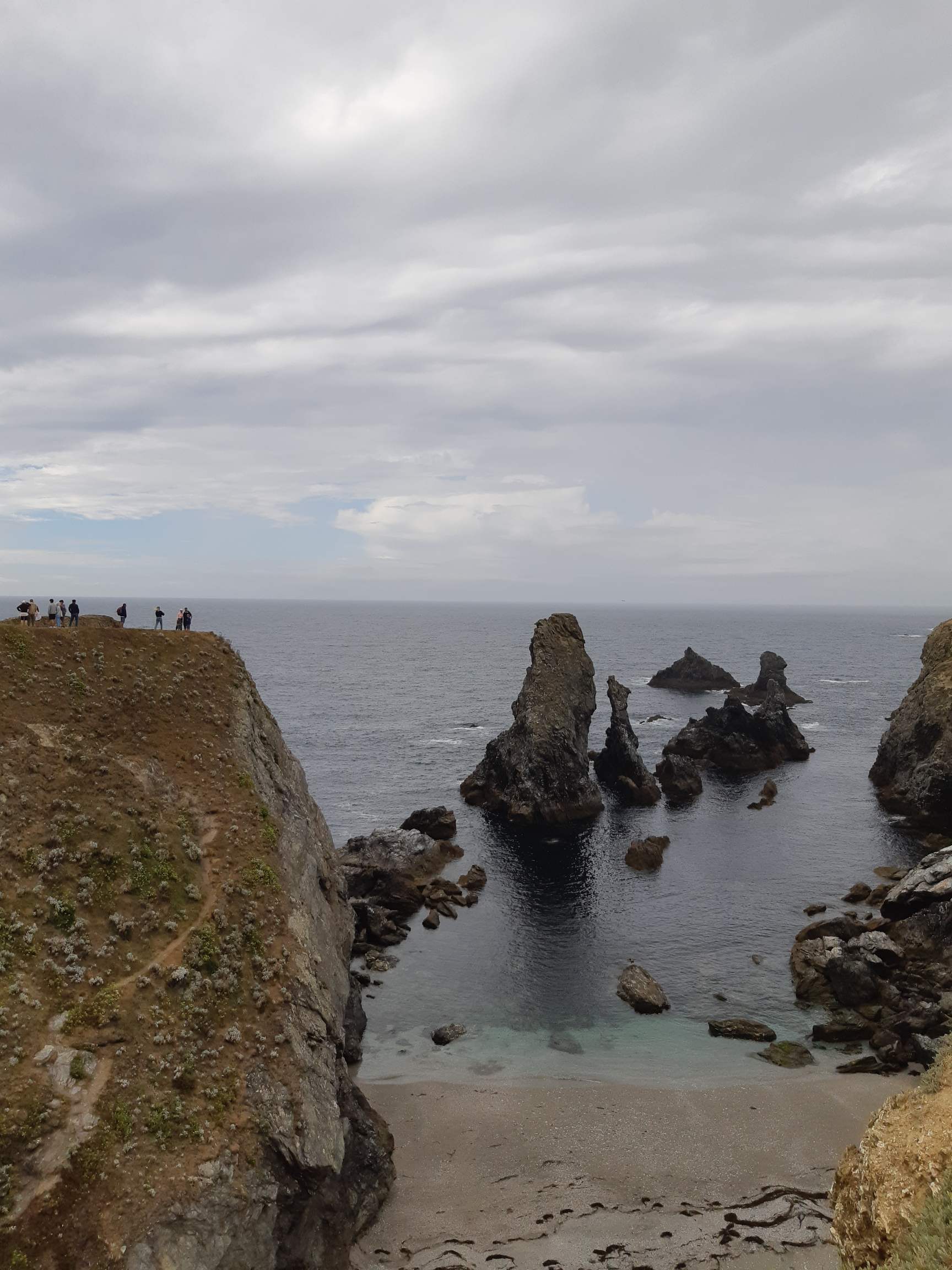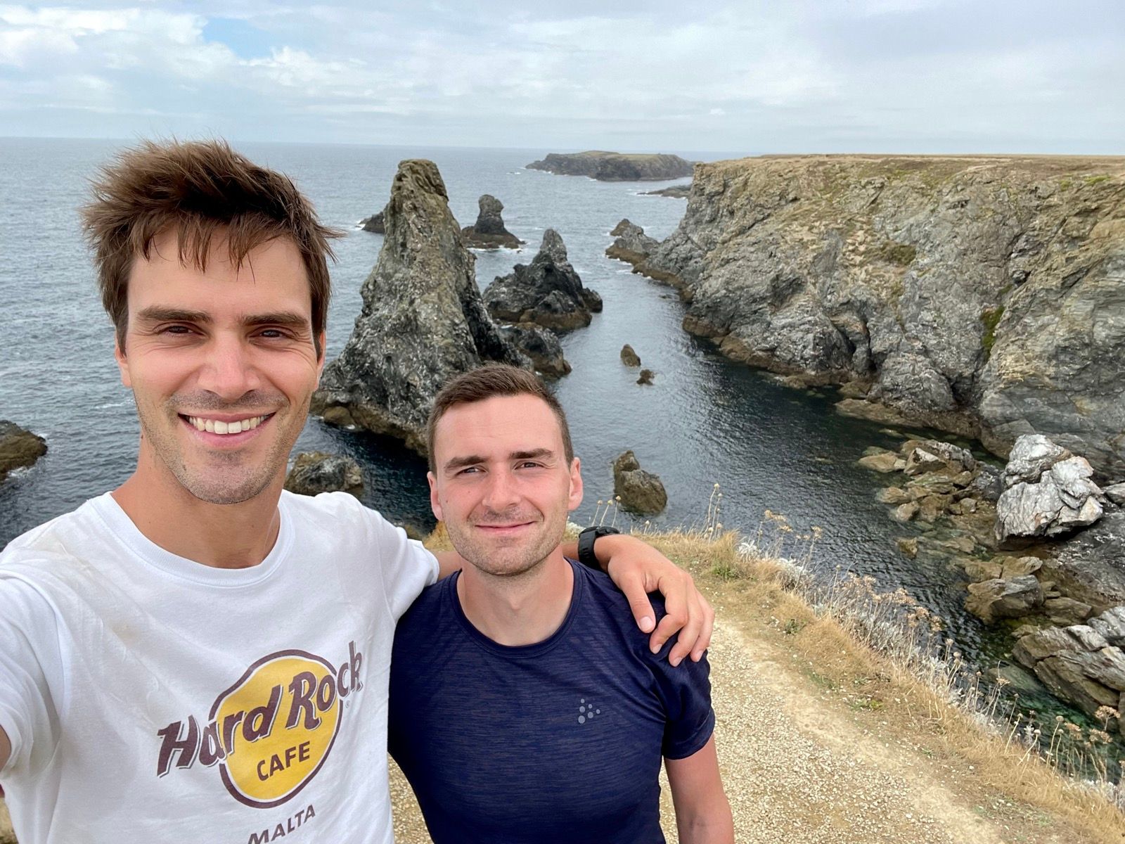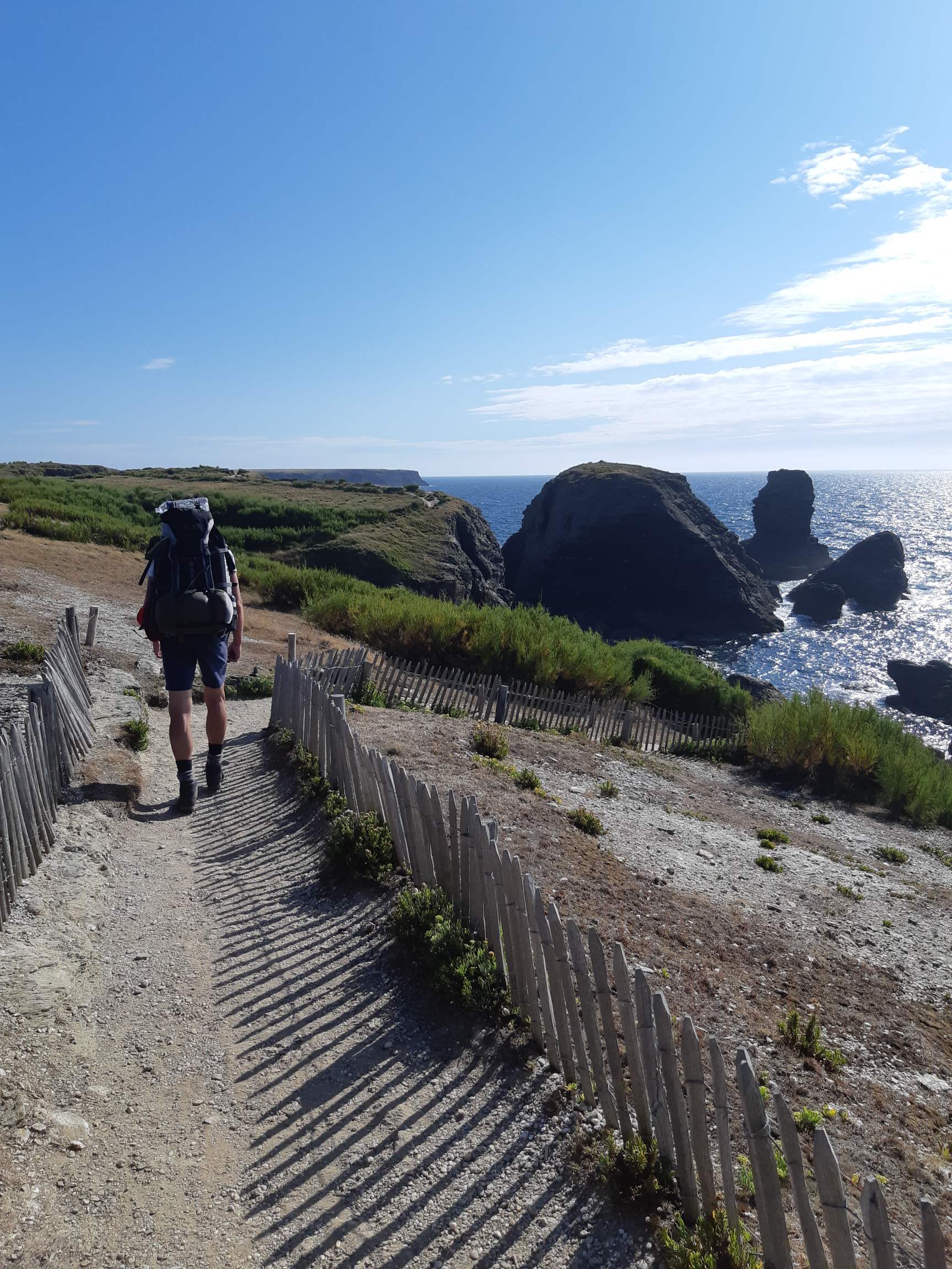 “L’étape reine” kondigt zich met veel bravoure en een zwoel opkomend zonnetje aan! Deze zuidelijke kust- en klifstrook wordt met recht en rede de “côte sauvage” genoemd. Het gekkenwerk waarover gisteren sprake wordt vandaag wél bewaarheid, met een amalgaam aan uitgehouwen ezelspaden die de baaien in- en uitslingeren. Een vooruitblik op al dat zware lekkers krijgen we vanaf het meteo- en radarstation op de uitstekende Pointe du Talut: voor ons tekenen krinklende winklende waterdingen kilometerslang het landschap, met aan de einder twee uitstekende Pointes.