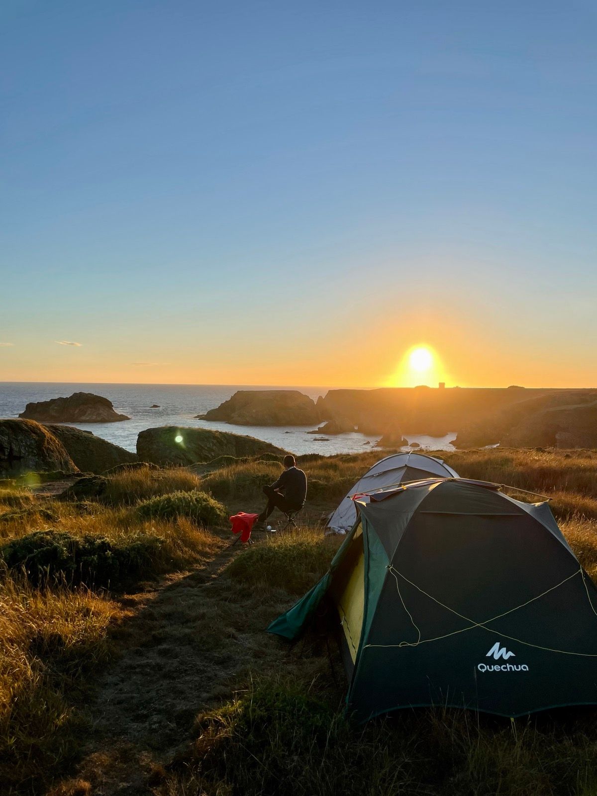 Langs een uitdagend golfterrein (dat aan alle elementen is overgeleverd), slaan we af op zoek naar een geschikte bivakplaats. Geschikt blijkt een uitermate groot understatement als we de Plage de Stêr-Vraz naarstig naderen. Met een verkwikkende zwempartij bij valavond spoelen we al het zweet en stof van ons af, waarna we vanuit een excellent arendsnestje boven de baai genieten van spijs en drank. Zelfs een meeuwenstront op onze tent is snel uit het geheugen en het zeildoek gewist. De ritmisch voorbij wuivende lichtbundels van de vuurtorens van Poulains (in het noorden) en Goulphar (die daags nadien continu ons zuidelijke mikpunt zal zijn) wuiven ons ten slotte gedwee in slaap.