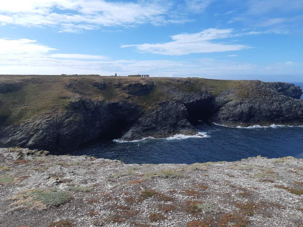 Als ware kustwachters flankeren enkele koene kajakkers en een lange colonne zeilschepen ons tijdens de eerste stondes van onze tweede wandeldag. Het is niet toevallig dat het ‘verkeer’ op zee hier iets toeneemt, want aan deze (zuid)westelijke kant van Belle-Île-en-Mer zijn de kliffen nog veel spectaculairder en dieper geërodeerd dan aan de lieflijkere oostkust. Ietwat contradictorisch misschien, maar net door die rijzigere rotsen is het wandelpad hier een tiental kilometer lang egaler, opener en minder glooiend. Al deze baaien naar beneden hotsen zou gekkenwerk zijn. Hoog en droog aanschouwen we ettelijke drijvende stenige kolossen, landtongen en grotten, met de Grotte de l’Apothicairerie als beste medicijn tegen hoogteziekte.