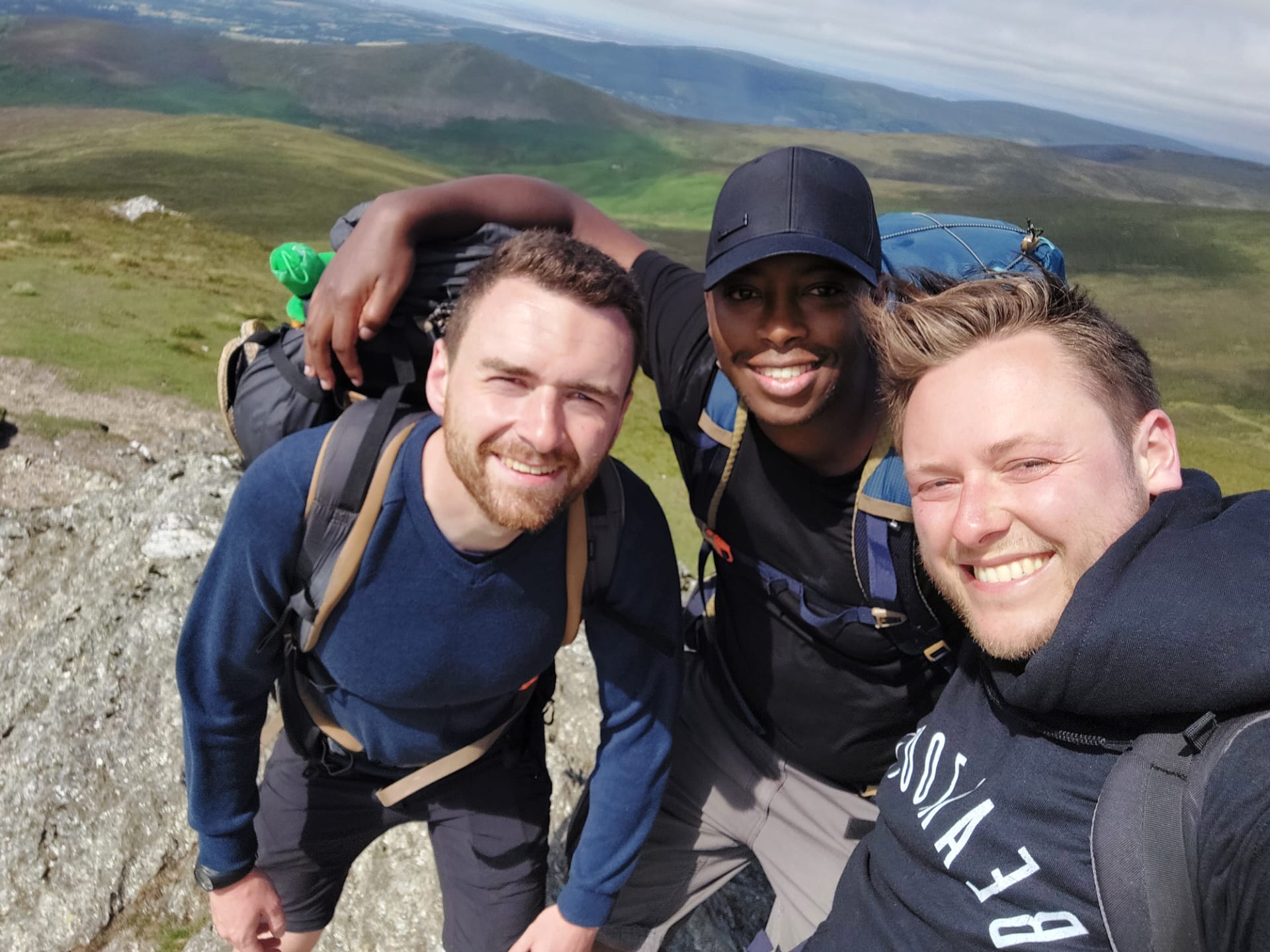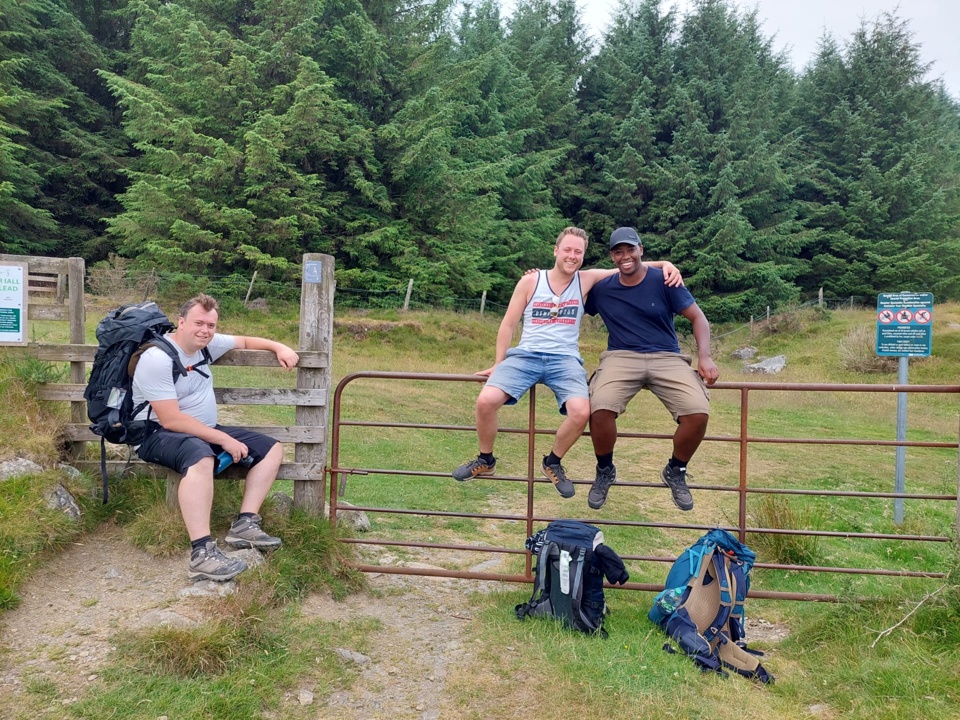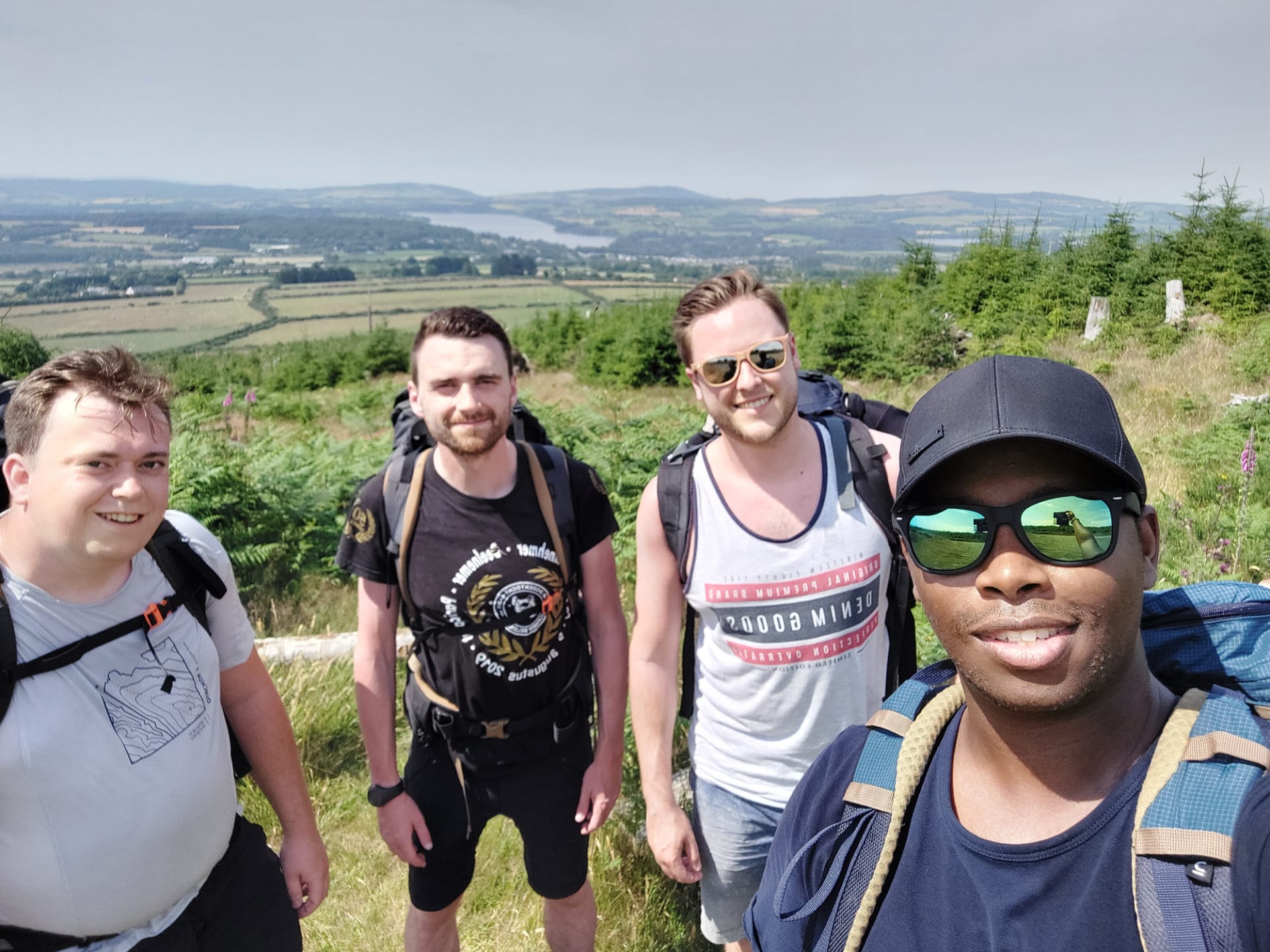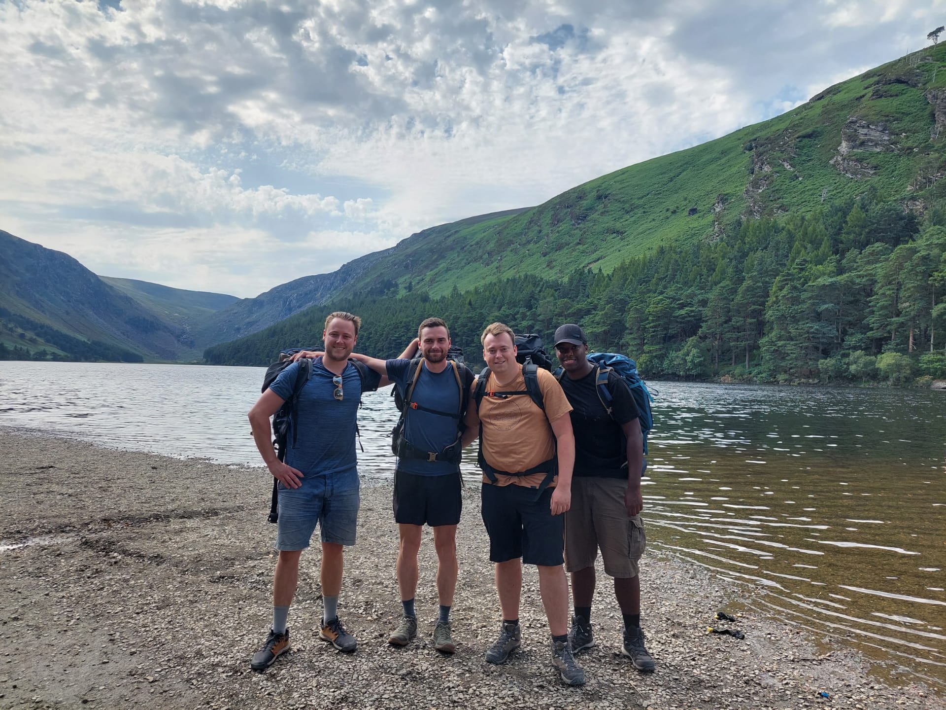 Over naar het echte werk: wandelen! Na anderhalf uur op de trein en een kwartiertje in de schoolbus kon onze vierdaagse exquise queeste aanvangen in valleigehucht Glenmalure. De bezongen oude, leergierige en vrome heilige uit onze aankomstplaats Glendalough gaf ons gedwee zijn zegen, want het Ierse weerstereotype ontkrachtend kregen we schitterend wandelweer van 25°C voorgeschoteld. Vanaf de eerste passen openbaarde de Wicklow Way zijn wonderlijke schoonheid, aanvankelijk met een bosrijke spiraalstijging en nadien met een rotsige tweetrapsraket naar het zenit van Mullacor Saddle. Op een hoogte van 600 meter werden we opgezadeld met de eerste kiekwaardige panorama’s (die de dagen nadien toch nietig zouden uitvallen ten opzichte van het iets noordelijker gelegen landschap).