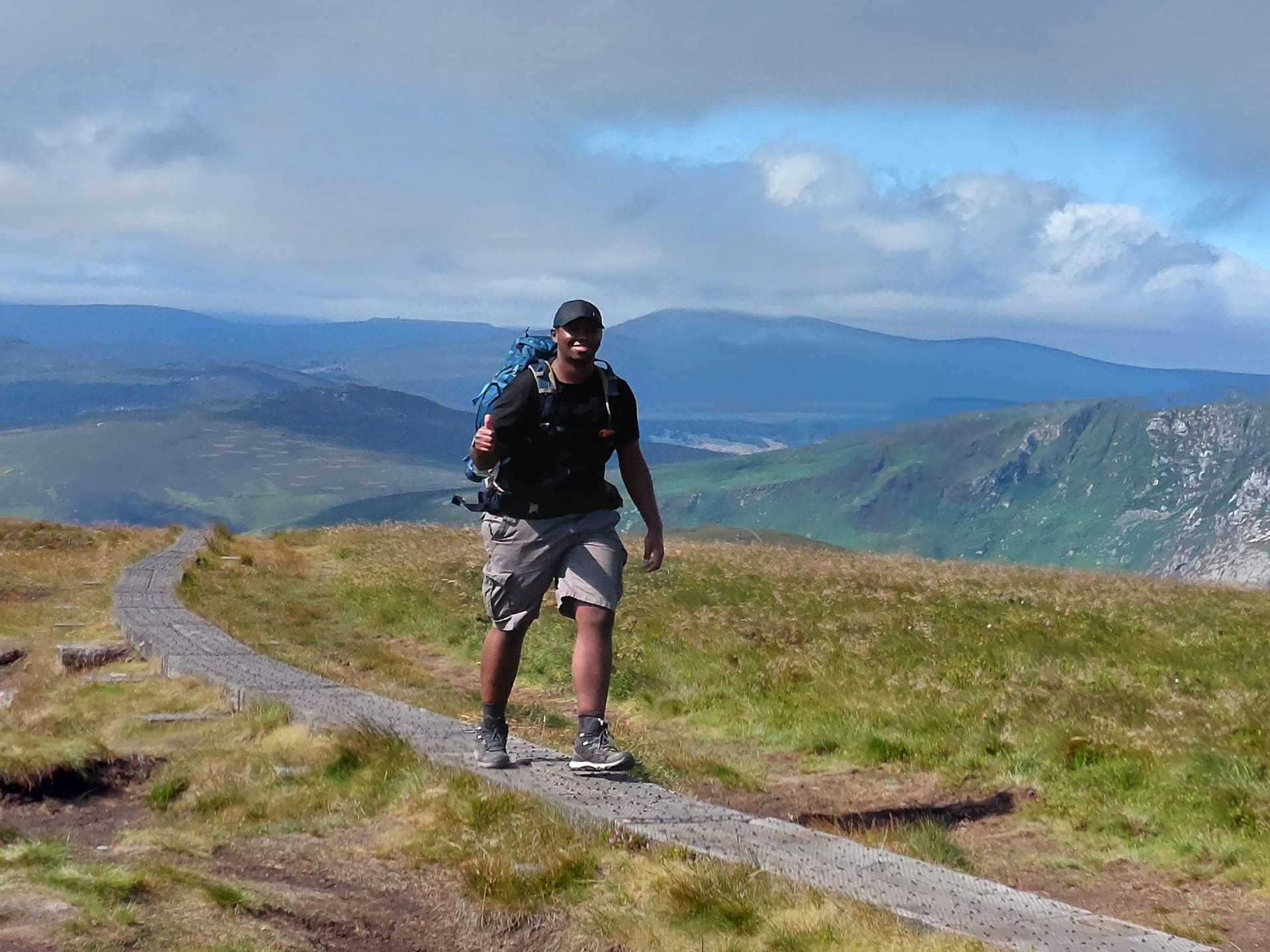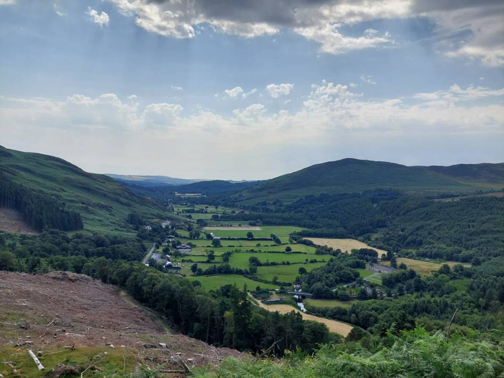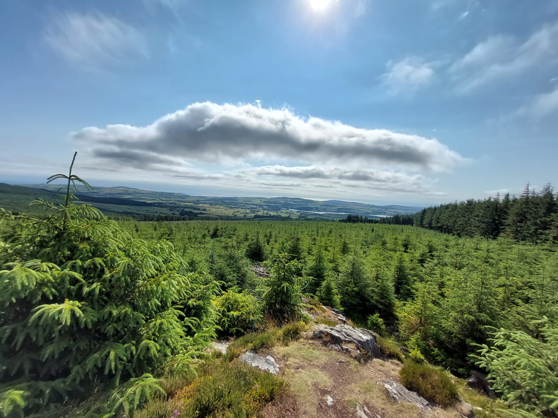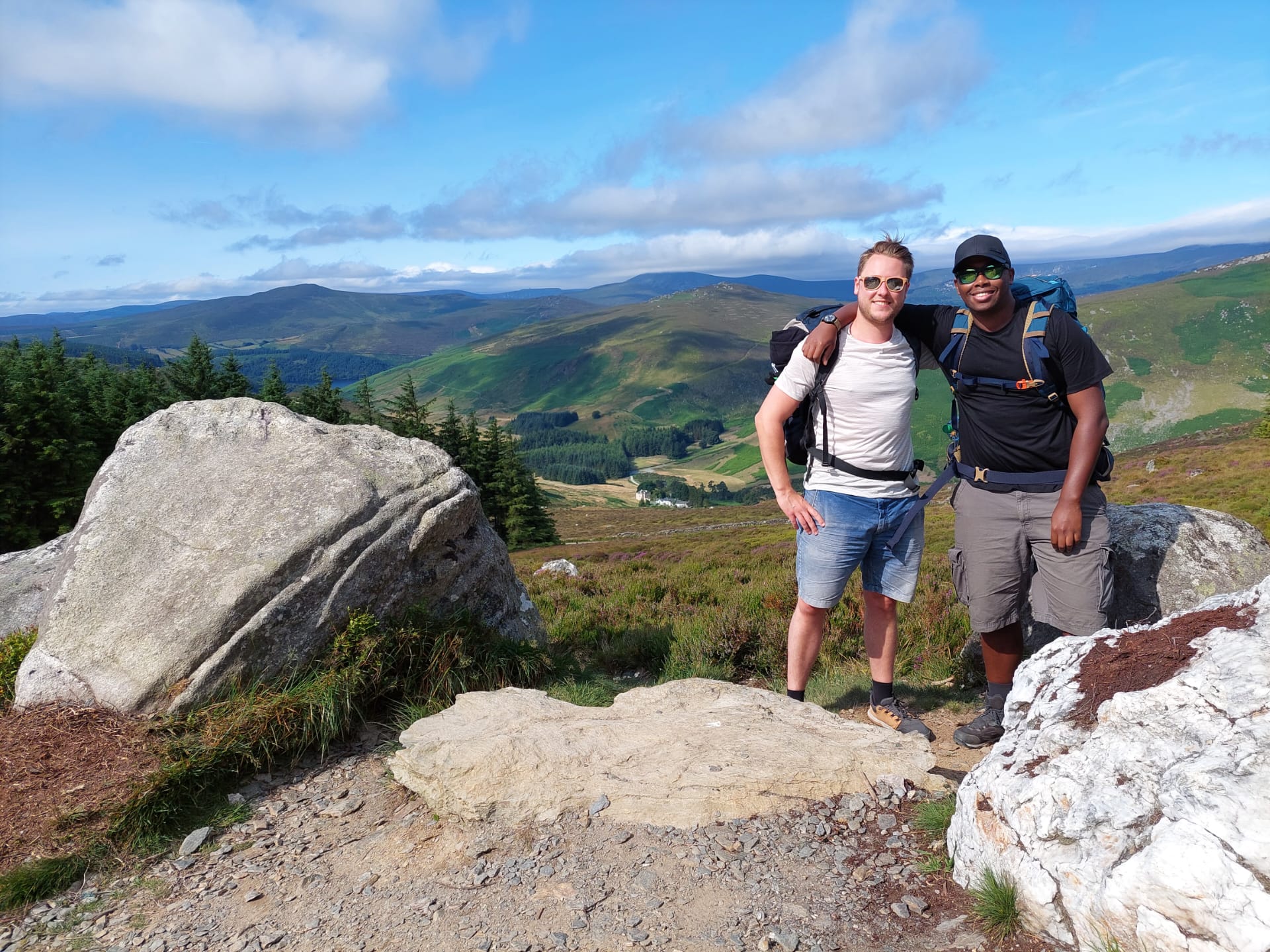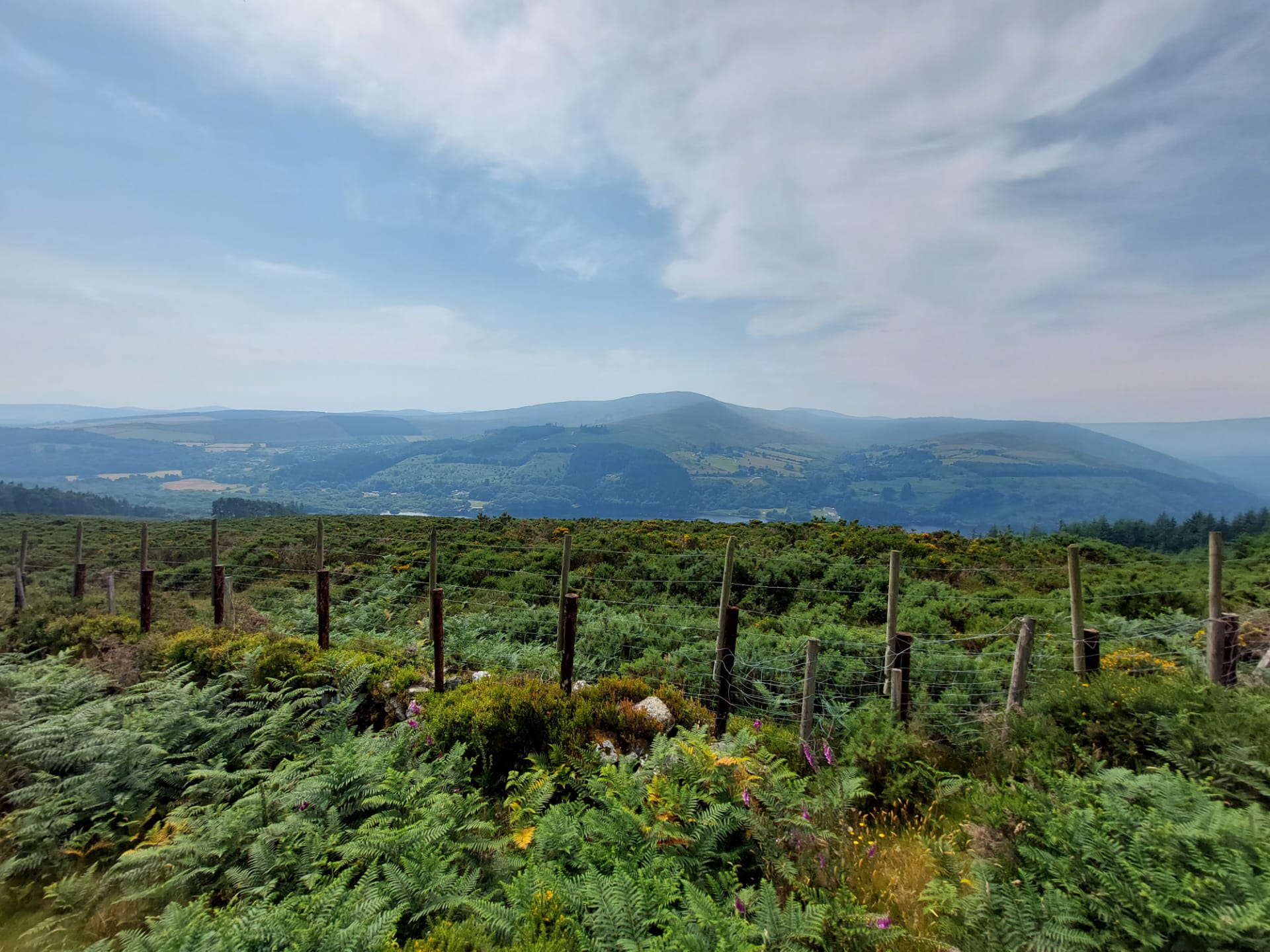 Wij waren nog steeds op de juiste weg! Na een kleine surpluslus als ochtendloopje (de 10km-lange bewegwijzerde Spinc and Glenealo Valley Walk; extreem de moeite, met schitterende uitzichten rondom het Upper Lake, langs grazende reeën en door een memorabel mijndorpje) nam de Wicklow Way ons weer mee in zijn zog. De kuiten werden opnieuw terstond geprikkeld langs enkele donkerbeboste heuvelhellingen boven de Glenmacnass-vallei, waarna met de zonovergoten Paddock Hill één van mijn persoonlijk plezantste klauterpartijen van de route opdoemde. Zonnecrème uitzwetend werden we beloond met een (terug)blik op het reeds bewandelde landschap.
