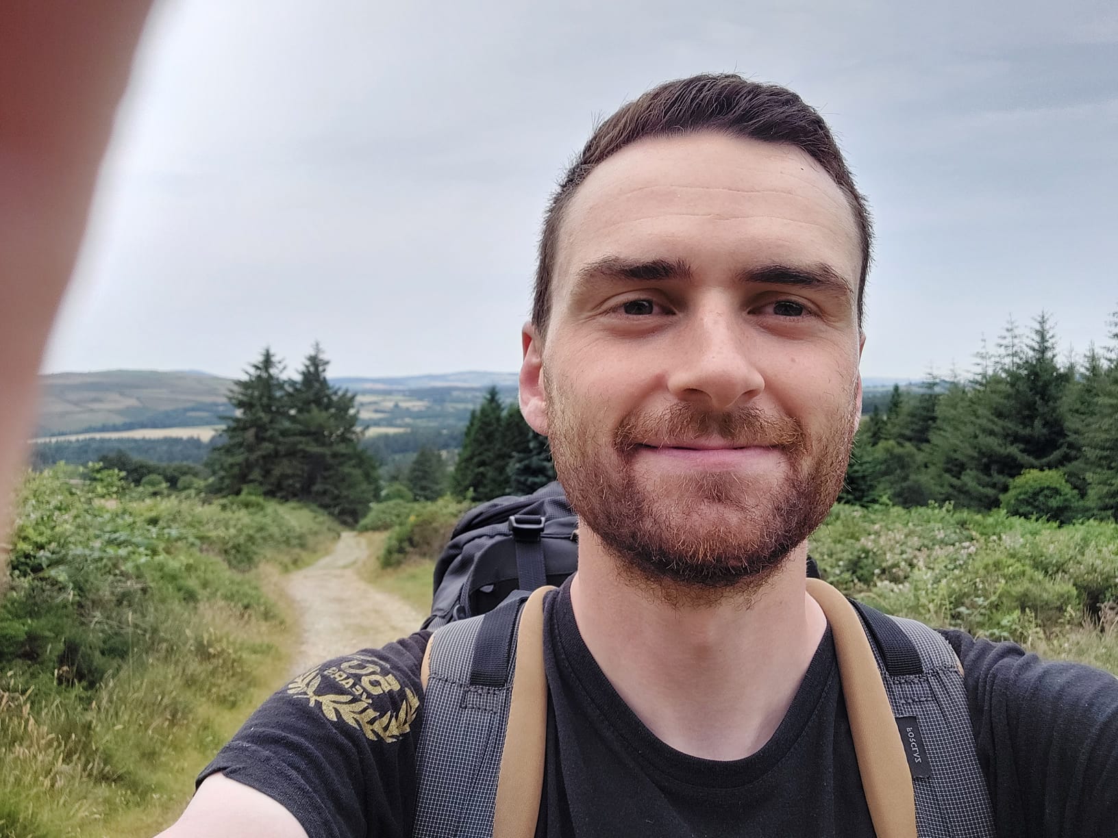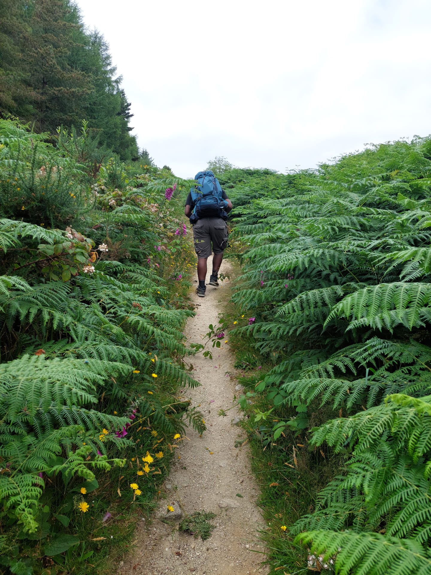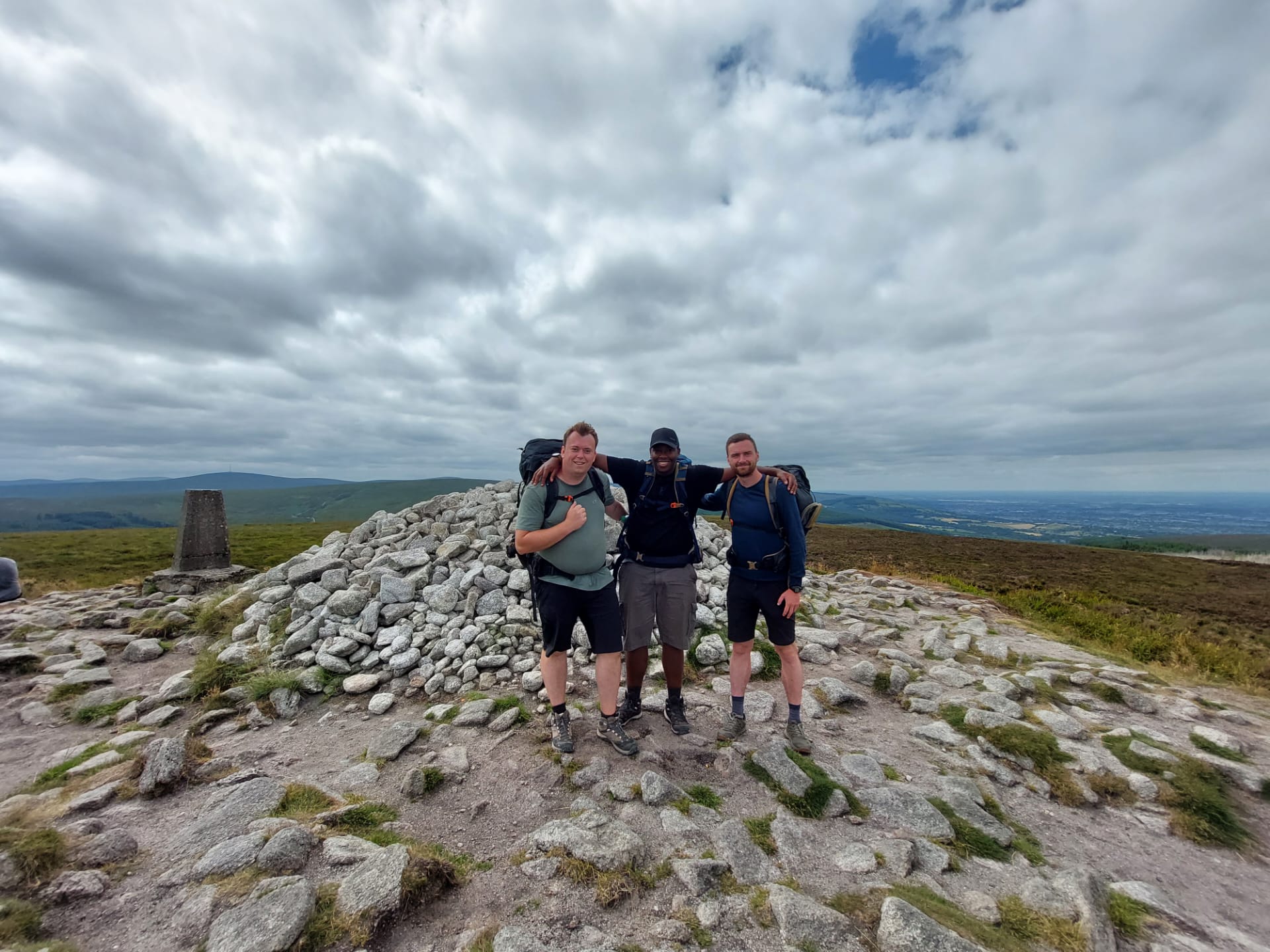 Djouce Mountain, met zijn 725 meter het hoogste punt van de Wicklow Way, verlaat enkele honderden meters het Pad, maar is absoluut de kleine omweg (die eigenlijk zelfs een shortcut is) waard! Als volleerde heuvelgeiten hinkelden we naar de top, waar een unuksuk-toren en geodetisch herkenningspunt enige houvast boden. Eenmaal wederom beneden ge(z)waaid ontloken de zon, een loodrecht niemendalletje als digestief én de lager gelegen Powerscourt-waterval zich aan ons zicht. Eén rouwmoment onderbrak deze prachtdag: onze pas verworven mascotte was plotsklaps vermist!