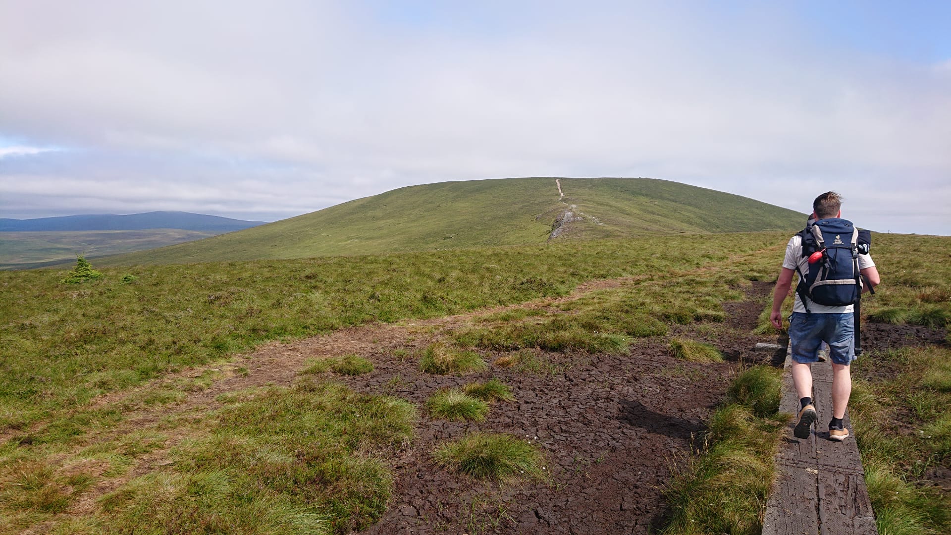 Samen met ons enthousiasme wakkerde nadien de wind ook aan. Beukend tegen dat element was het spitsroeden lopen om ons evenwicht te behouden op het smalle houten wandelpad. Een misstap was gelukkig geen te erg abuis, want het omliggende weiland verzoop op de meeste plaatsen niet in zijn zompigheid. Waar de Wicklow Way aan een vliegtuigcrashsite oostelijk draait, snuffelden wij nog enkele honderden meters verder in noordelijke richting.