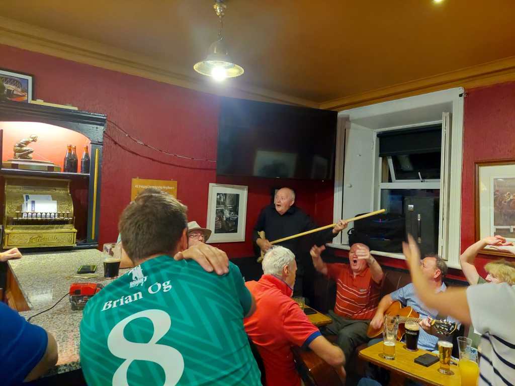 Een lommerrijke bochtentocht rond de Glencree-rivier en een passage tussen torenhoge varens (waar een plompverloren hinkende fietsster zowel het noorden als het zuiden kwijt was) hielpen om het mascottemankement te boven te komen. Ook het avondrelaas in het typische Ierse Enniskerry was warempel weer de moeite. Drie dingen blijven me van die avond bij: de traditionele Ierse gezangen (en bijhorende luchtgitaarsolo’s) in de pubs zijn écht cultureel erfgoed om te koesteren, een “kleine Guinness” hoef je absoluut niet te koesteren én het adagium dat Ieren en Engelsen elkaar nauwelijks kunnen luchten, klopt wel degelijk als een dubbeldekbus.