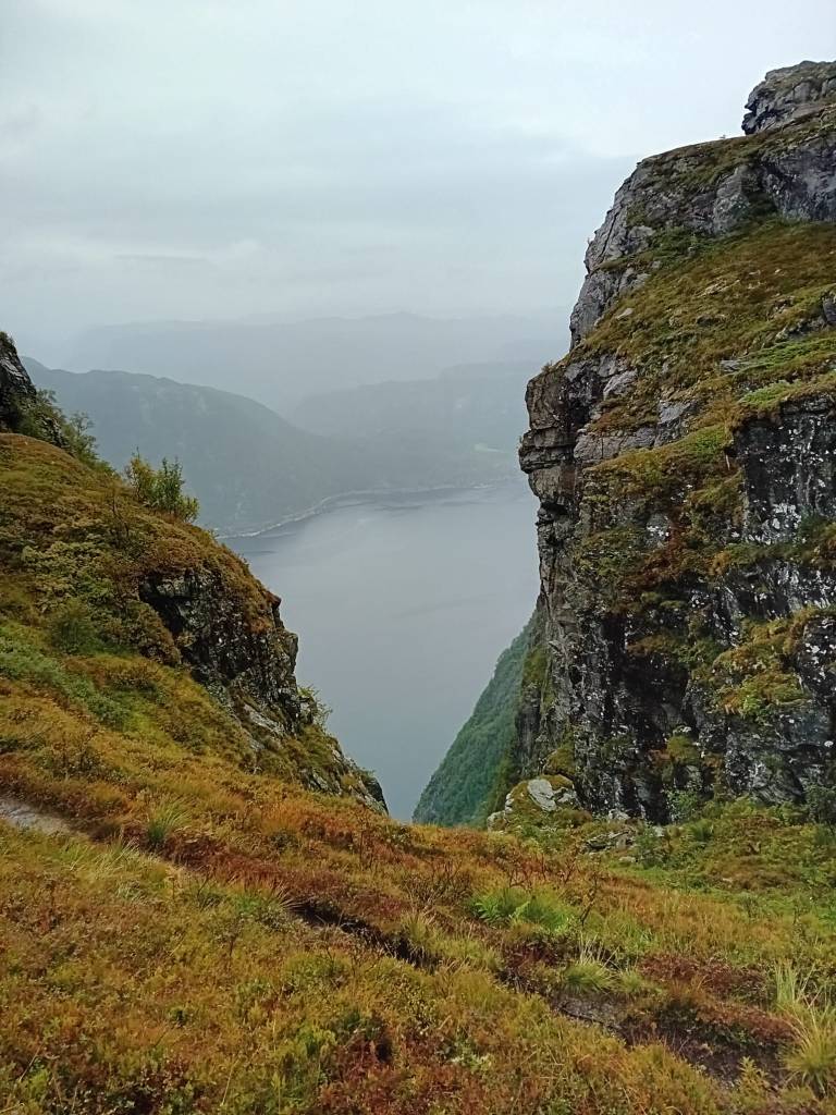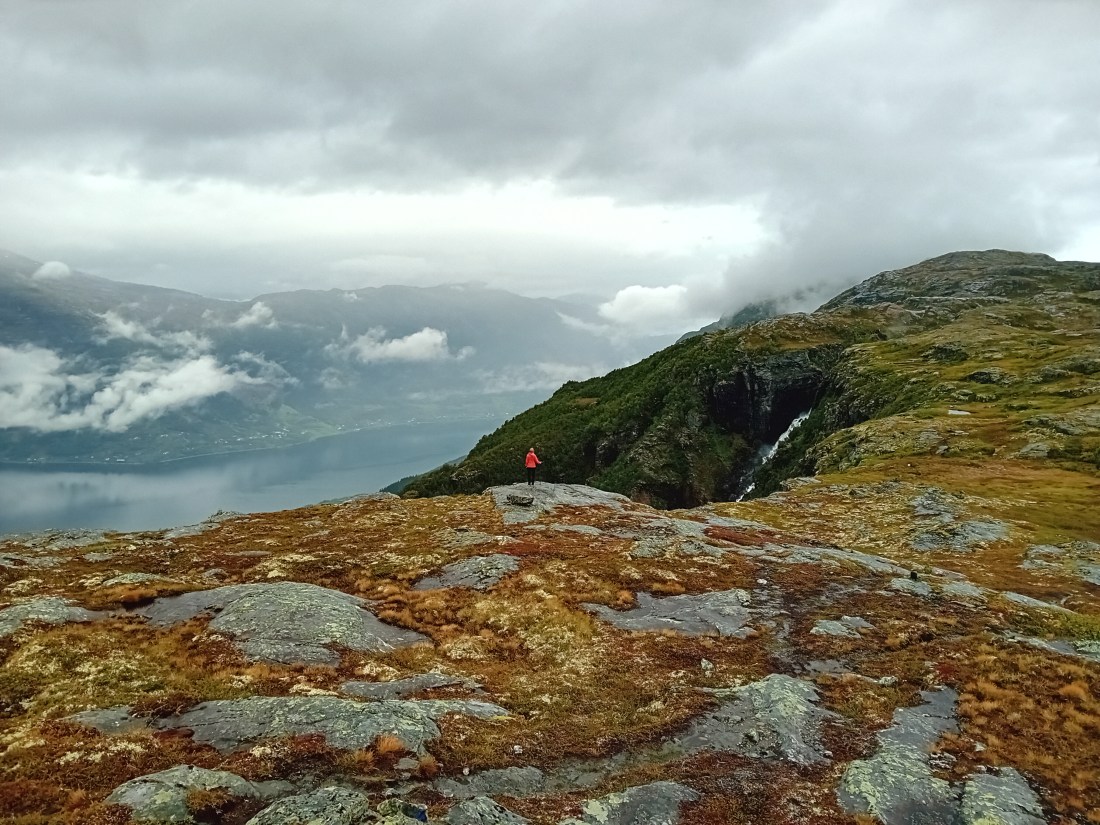 Eenmaal boven de bomengrens, gidsen struikjes en mossen je verder door een surreëel nat rotslandschap. Een hooggelegen panoramameertje leent zich tot een picknick en/of schuilen tegen de regen. Na een laatste V-beweging rond de fjordenklif baan je je een wonderlijke weg naar de Rots van de Schoenmaker en de nog iets hoger gelegen inuksuk. Het Jøsenfjord en vele andere fjordenarmen duizelen prachtig in de diepte en verte. Een wandelopener om U tegen te zeggen!