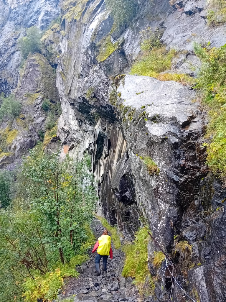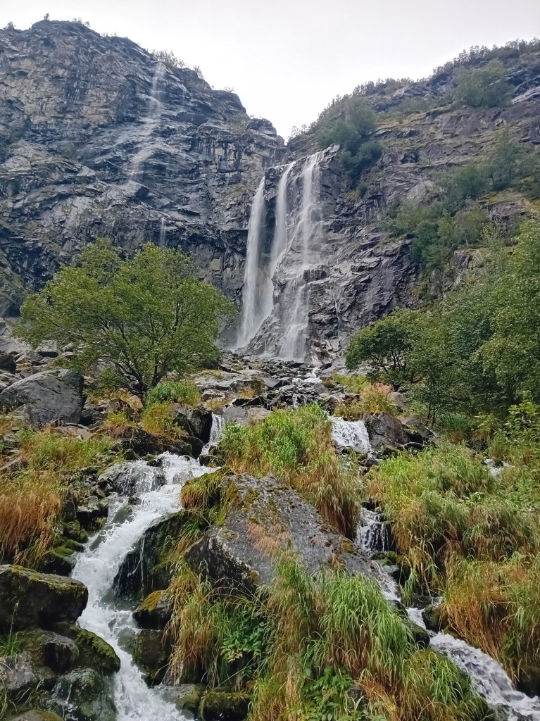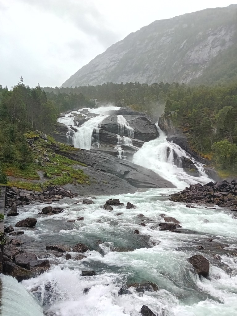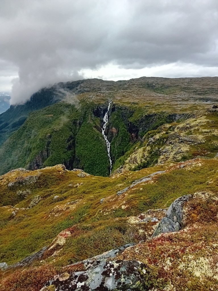 Gedurende vier kilometer laaf je je hier fantastisch aan de eerder bezongen Rjukanwaterval, terwijl je tussen meertjes, over mossige rotsjes en enkele honderden meters effectief over de klifrichel voortschrijdt. Na die rigoureuze richelroede komt Skrikjofossen echt piepen. Hier zie je mooi hoe de relatief rustige plateaurivier plotsklaps als een malle over de rand valt en alzo voor een feestelijke neerwaartse aanblik zorgt. Geniaal om ’s ochtends nog vanuit kikvors- en nu vanuit vogelperspectief dit waterspektakel te aanschouwen. Voor de Skrikjofossen-oversteek zoek je best een voor jou comfortabel aanvoelende stek uit. Wij kiezen (net als de voetstappen voor ons) voor een plekje enkele tientallen meters links van de officieel uitgebaande crossing. Je schoenen zullen sowieso al nat zijn, dus over droge voeten hoef je niet te hoeden.