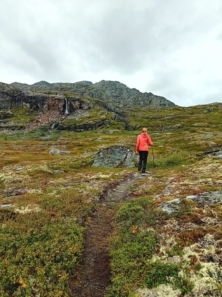 De verwelkoming bovenop Hardangervidda kan niet hartelijker zijn: de wilde Rjukan-waterval zegent je voor ze als Oppo-waterval helemaal de dromerige dieperik induikt. Terwijl je op adem komt van de beklimming, word je terstond de adem ontnomen. Gegarandeerd! Aan deze waterval heb je trailmatig drie opties: noordelijk daalt de Koninginnetrail weer af, zuidelijk ontdekt de Koningstrail het hart van Hardangervidda en rechts de Oppo-hangbrug over verkent een blauwgemarkeerd pad de bevallige (en watervallige) plateaurand. Wij nemen die blauwe afslag. Het is merkbaar de minst gangbare route, want de signalisatie is niet bijster legio en op de moerassige ondergrond is het soms speuren naar het gevormde pad. Foutlopen is echter schier onmogelijk, zolang je de klifrand blijft volgen.