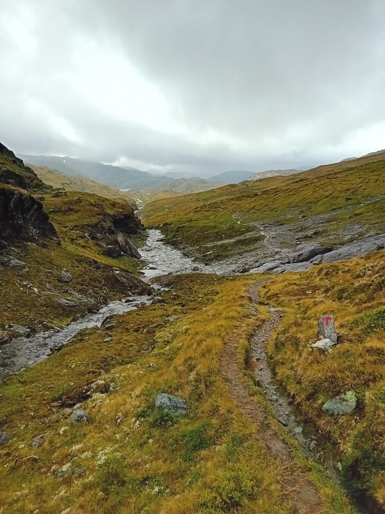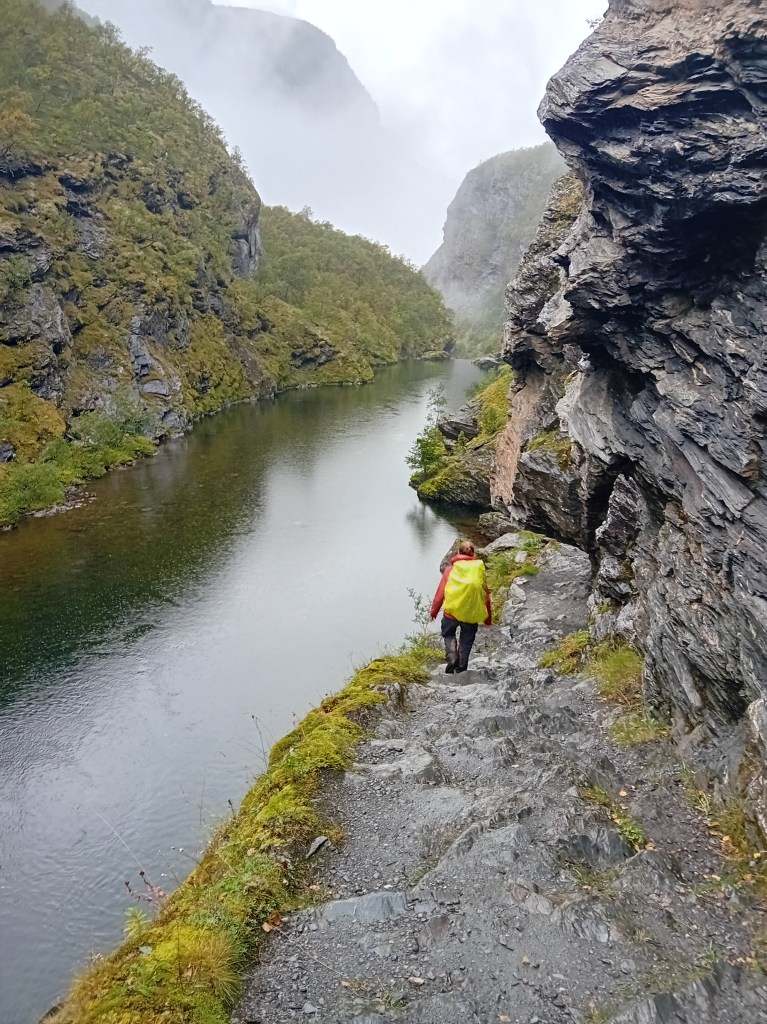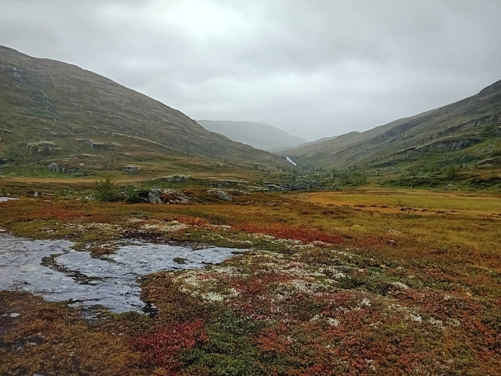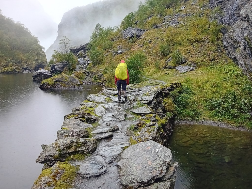 Onze tweede etappe valt helaas letterlijk danig in het water. Immense regenbuien en felle windvlagen nemen ons de wind uit de zeilen. Waarschijnlijk gestuwd door die ongunstige factoren vinden we het landschap hier ook minder indrukwekkend: ietwat eentonig flaneer je op de heuvelkam door malle moddermassa’s. Het Aurlandsdal zelf blijft wel indrukwekkend, met zowel links als rechts fluks oprijzende kammen. Helaas ontsiert een hoogspanningslijn dat zicht enkele kilometers lang. Onze ietwat bedrukte stemming kantelt gelukkig weer goedhartig door een Sherlock Holmes-fanatieke barman in de Steinbergdalshytta, een tapdansende lemming (wiens oorlogsdansje eerder humoristisch dan angstaanjagend is) en een Scrabble-spektakelspel in de Aurlandsdalen Turisthytta, die als onderkomen ons kletsnatte tentje vervangt.
