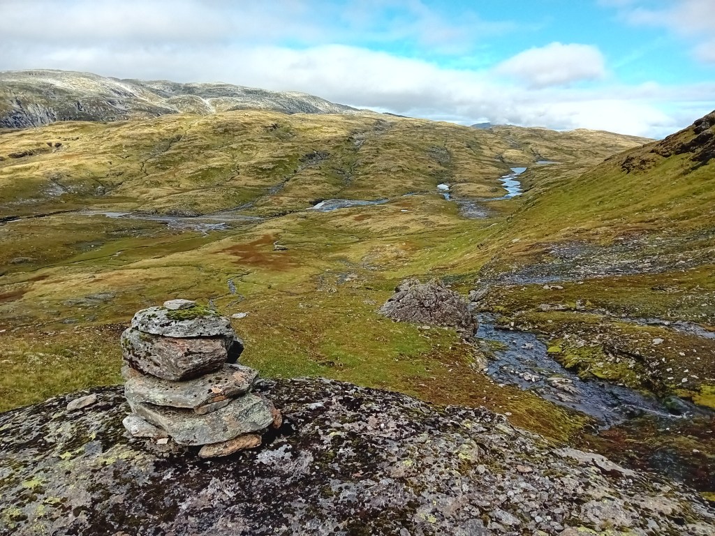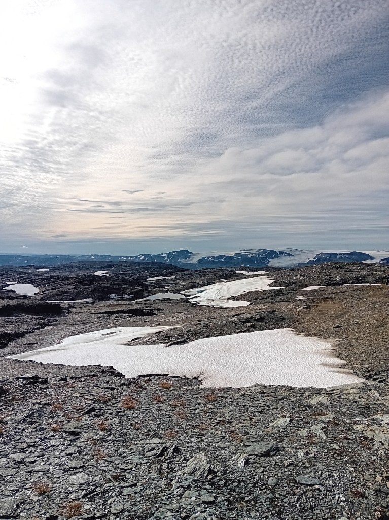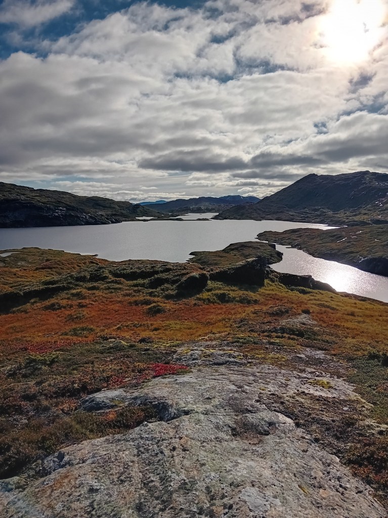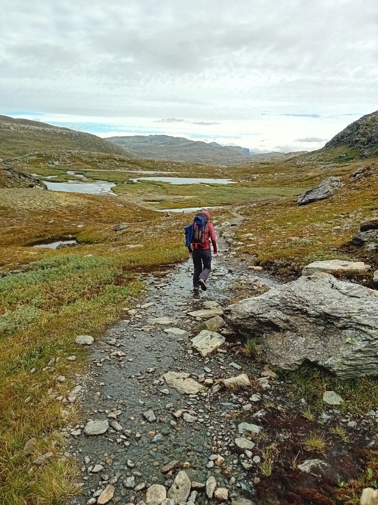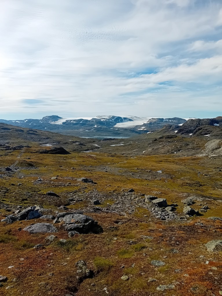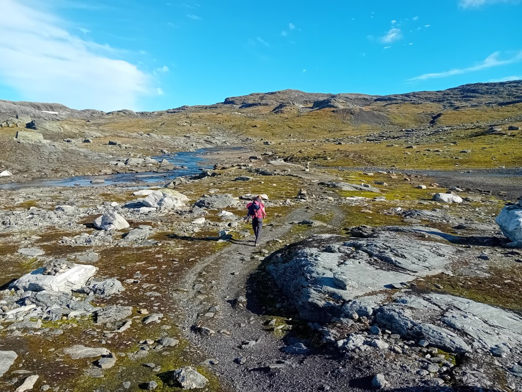 De driedaagse Aurlandsalen-hike gaat globaal in dalende lijn, maar de eerste etappe denkt daar anders over. Vanuit Finse is het eerst zes kilometer fameus fabuleus klimmen door een zowel groen, grijs als sneeuwwit waterige wereld, die zich het best als buitenaards laat omschrijven. Wij waren er begin september, laat in het seizoen, waardoor de sneeuwlapjes schaars waren. Wandel je er in het begin van de zomer, dan bedekt het witte deken een groot deel van deze klim. Tijdens de noordelijke afdaling worden de gletsjermeren steeds talrijker en het landschap eveneens weer mossiger, tot de Geiteryghytta je na 17 kilometer in de armen sluit.