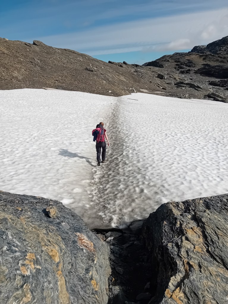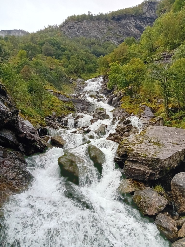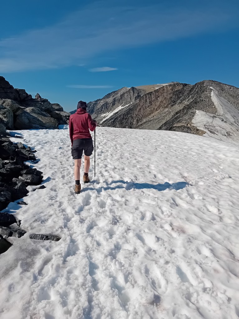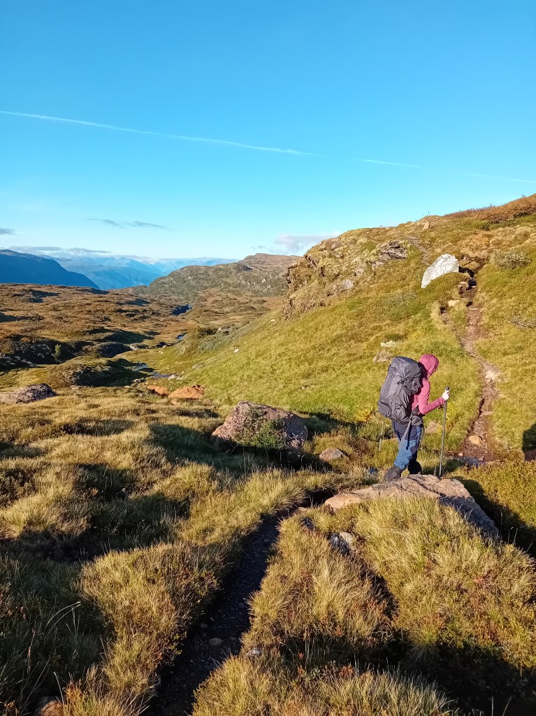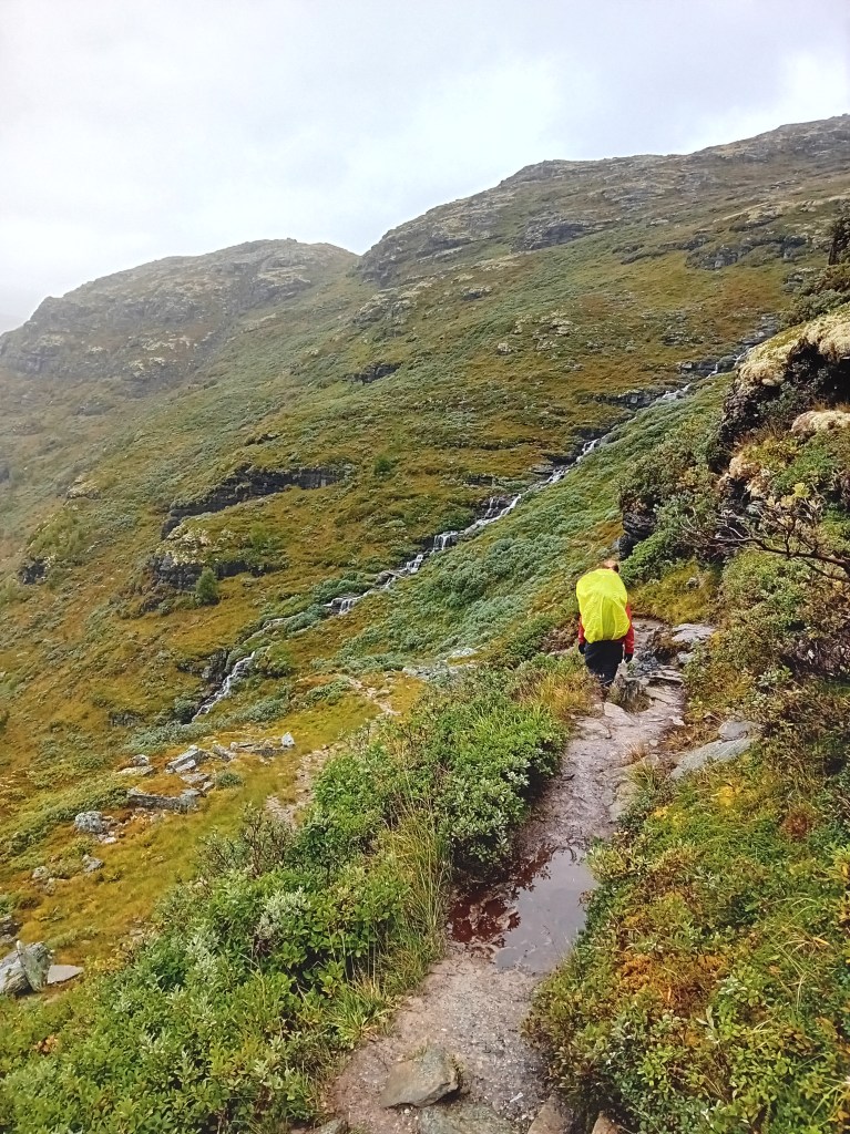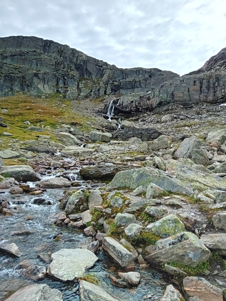 De driedaagse Aurlandsalen-hike gaat globaal in dalende lijn, maar de eerste etappe denkt daar anders over. Vanuit Finse is het eerst zes kilometer fameus fabuleus klimmen door een zowel groen, grijs als sneeuwwit waterige wereld, die zich het best als buitenaards laat omschrijven. Wij waren er begin september, laat in het seizoen, waardoor de sneeuwlapjes schaars waren. Wandel je er in het begin van de zomer, dan bedekt het witte deken een groot deel van deze klim. Tijdens de noordelijke afdaling worden de gletsjermeren steeds talrijker en het landschap eveneens weer mossiger, tot de Geiteryghytta je na 17 kilometer in de armen sluit.