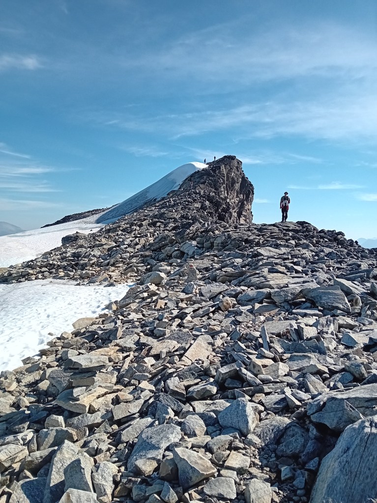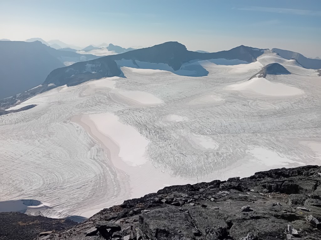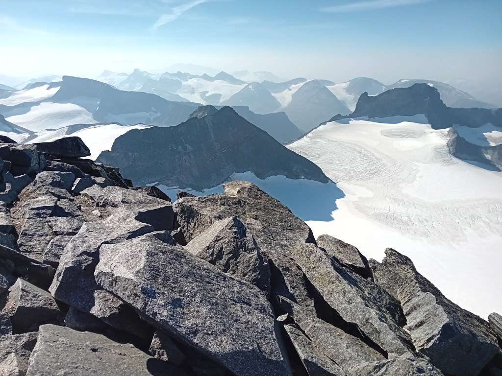 Richting de tussentijdse Keilhaus-top is het even pittig klimmen én afdalen, waarna het plafond van Scandinavië nog maar enkele lendenrukken verwijderd is. Bovenop dat noordelijke dak valt het uitzicht nagenoeg niet te beschrijven. Witte en zwarte reuzen poseren trots zover het oog rijkt. De terugtocht verloopt over hetzelfde pad, maar door het omgekeerde stramien word je alsnog slag om slinger verrast door de omgeving. En ben je stiekem trots dat je deze heftige helling enkele uren eerder naar boven geslopen hebt. Wij deden heen en terug acht uur over deze grandioze Galdhøpiggen-hike, veel mooier gevuld kan een dag niet zijn.